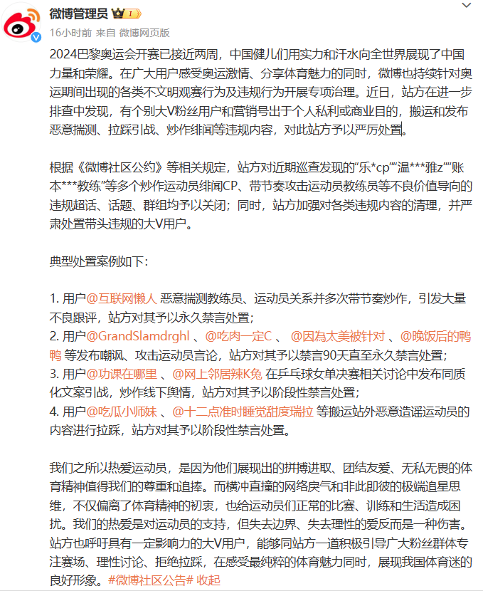 根据《微博社区公约》等相关规定,站方对近期巡查发现的“乐*cp”“温***雅z”“账本***教练”等多个炒作运动员绯闻CP、带节奏攻击运动员教练员等不良价值导向的违规超话、话题、群组均予以关闭;同时,站方加强对各类违规内容的清理,并严肃处置带头违规的大V用户。