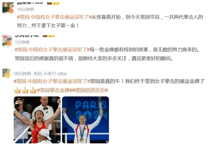 与东京奥运会时抱憾而归不同,这一次,常园笑到了最后。等待结果时,常园已迫不及待地挥舞起拳头,当裁判宣布“红方胜利”时,常园高兴地跳了起来。随后她冲向场边的教练,后者则钻入拳台,将她高高举起。随着五星红旗缓缓升起,常园噙着泪水,大声在领奖台上唱着国歌。这是自2012年伦敦奥运会设立女子拳击项目后,中国队在这个项目上的第一枚奥运金牌。为了这一瞬间,中国队已等待12年,常园则准备了15年。