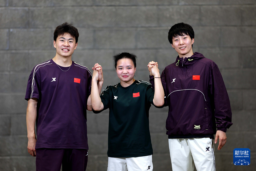三名获得巴黎奥运会资格的中国选手亓祥宇、刘清漪和曾莹莹(从左到右)合影。新华社记者 曹灿 摄