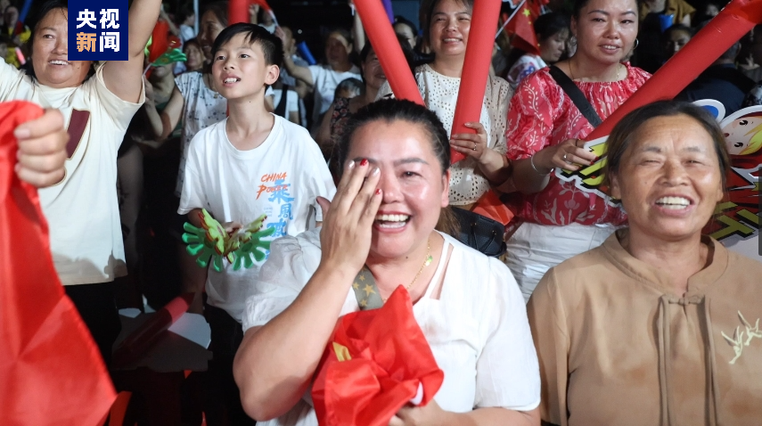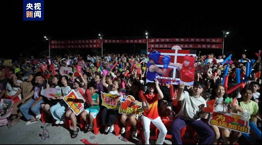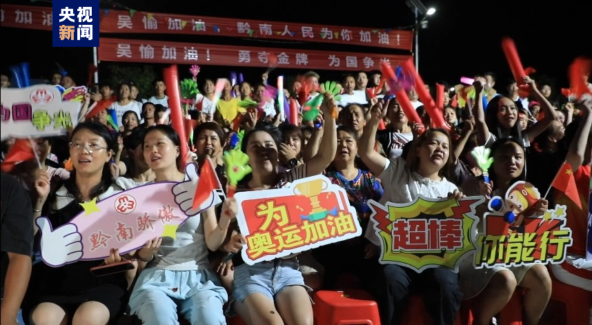 凌晨4时,吴愉的老家——黔南州贵定县昌明镇文江村灯火通明。村里的篮球场周围拉满了为吴愉加油的横幅,场坝上投影着巴黎奥运会直播比赛现场,300多名村民早早来到篮球场,为吴愉加油喝彩,呐喊助威!