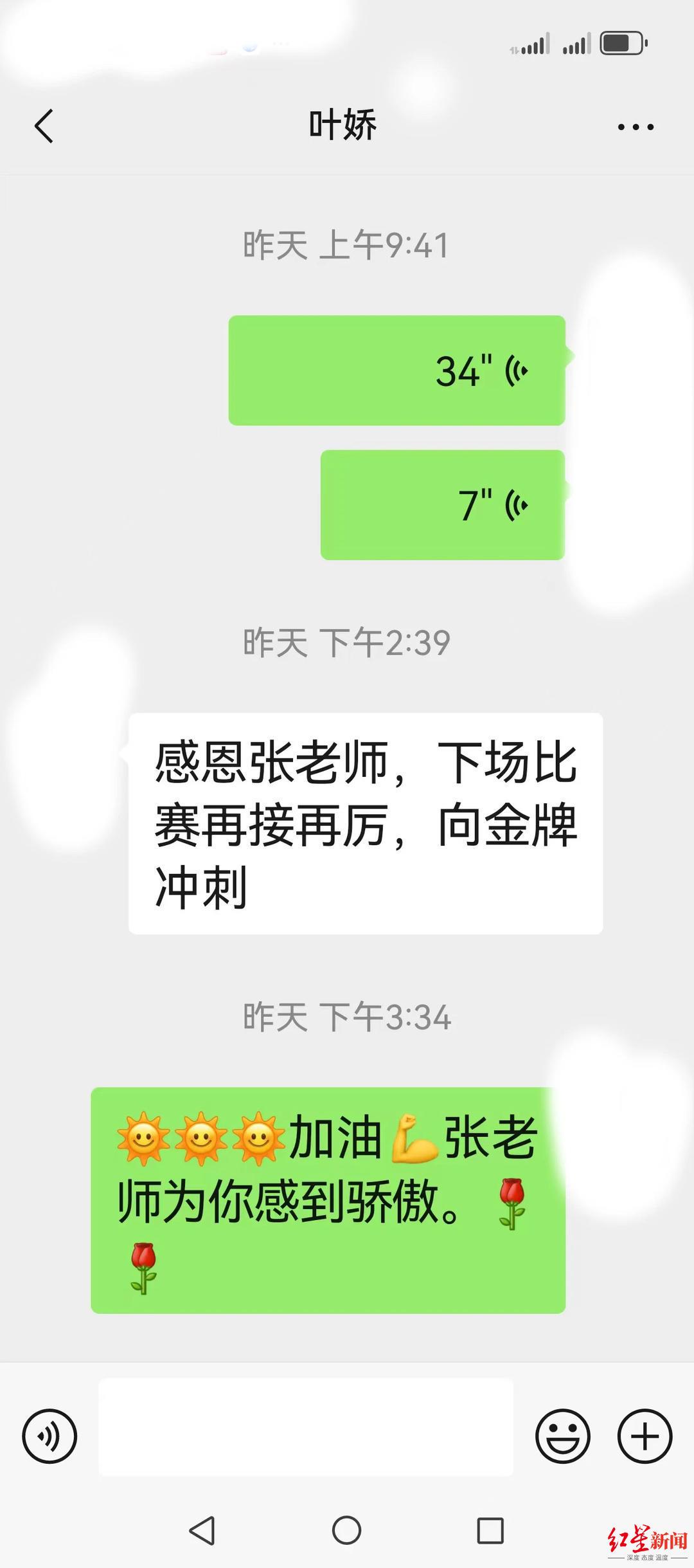 记者还了解到,决赛前两天,叶娇在天府新区华阳中学时期的曲棍球启蒙教练张刚富给她发微信表示祝贺,并为叶娇加油打气。