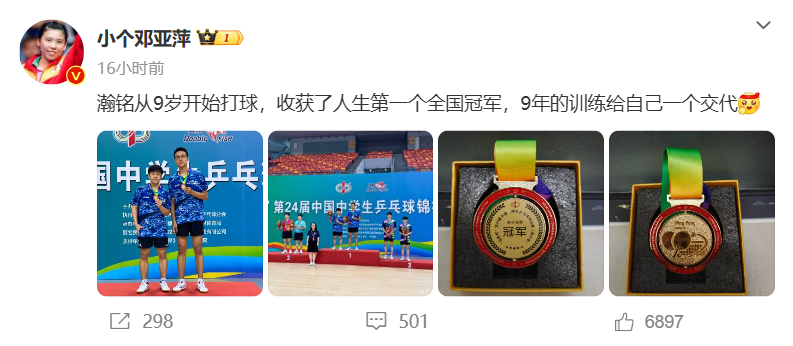 邓亚萍写道:“瀚铭从9岁开始打球,收获了人生第一个全国冠军,9年的训练给自己一个交代。”邓亚萍晒出的照片显示,其儿子林瀚铭参加比赛为“双鱼杯”第24届中国中学生乒乓球锦标赛,在高中组男子双打项目中获得一枚金牌。