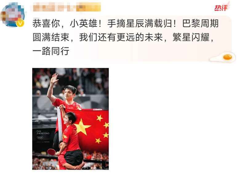 樊振东微博上很多网友送上祝福。大家肯定樊振东已经用实力证明了自己,同时也祝福他,人生的每一段幸福和快乐是结局。
