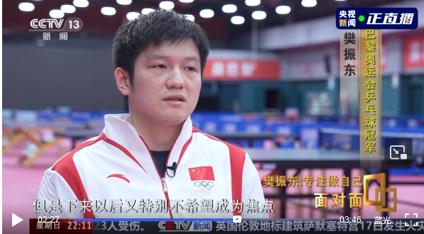 8月18日,在接受《面对面》采访时樊振东坦言,一度因饭圈文化感到困扰。他说:“场外很多东西被过度关注,压力很大。有时候会觉得输球不行,赢球好像也没那么行。这对我、对队伍、对乒乓球、对大家的团结,有百害而无一利。”同时,他也谈到,希望在赛场成为焦点,赛后不希望成为焦点。赛后很多东西被放大,会觉得压力很大,无所适从。