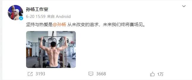 其实早在巴黎奥运会开赛之前,关于孙杨复出的消息就不曾间断。今年5月28日,孙杨为期4年零3个月的禁赛正式结束。当天,孙杨工作室就发文表示:“超越自我,泳者无畏”。随后的6月20日,工作室晒出了孙杨进行力量训练的照片,并配文“坚持与热爱是孙杨从未改变的追求,未来我们终将赛场见。”