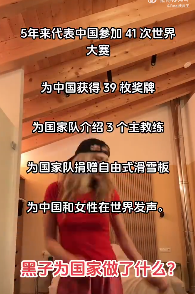 谷爱凌在视频中写道:“(自己)5年来代表中国参加41次世界大赛,为中国获得39枚奖牌,为国家队介绍3个主教练,为国家队捐赠自由式滑雪板,为中国和女性在世界发声,黑子为国家做了什么?”