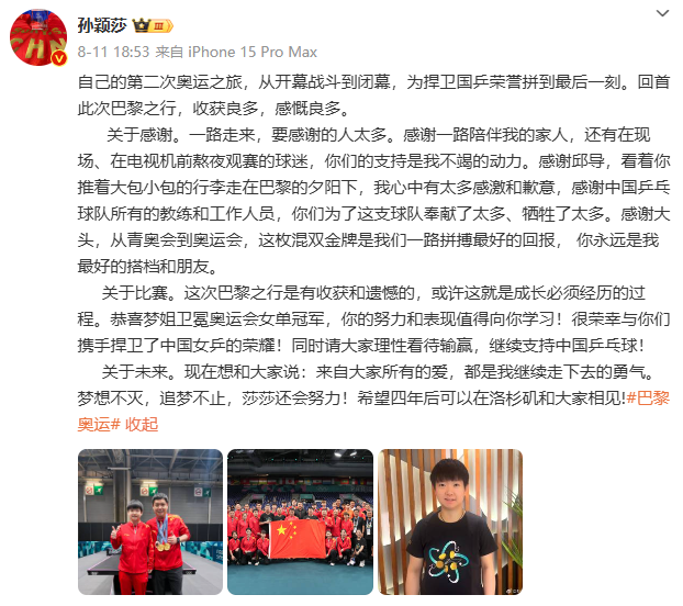 在巴黎奥运会结束后,孙颖莎也发博称:“希望四年后可以在洛杉矶和大家相见!”