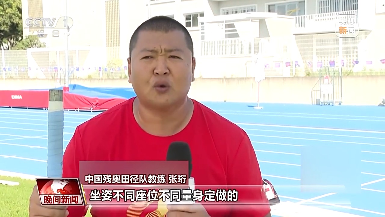 中国残奥田径队教练 张珩:这个投掷凳是根据每个人坐姿不同、座位不同量身定制的。随着每个人坐在这个上面投掷姿势不一样,他们脚和腿的部位放的也都不一样,所以要经过很久的磨合。
