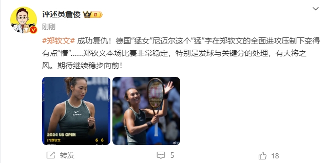 美网女单第三轮,郑钦文两盘拿下尼迈尔,晋级16强。赛后,评述员詹俊发文点评。