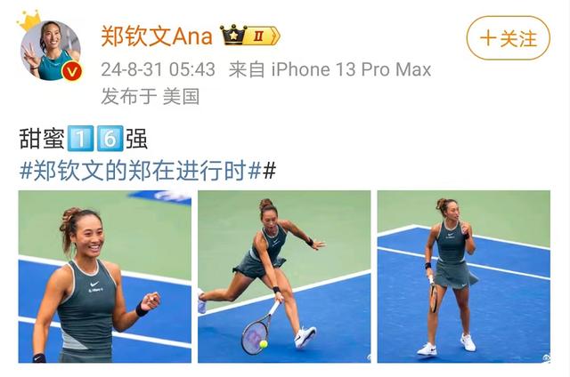 赛后,郑钦文在微博上晒图,并配文“甜蜜16强”。