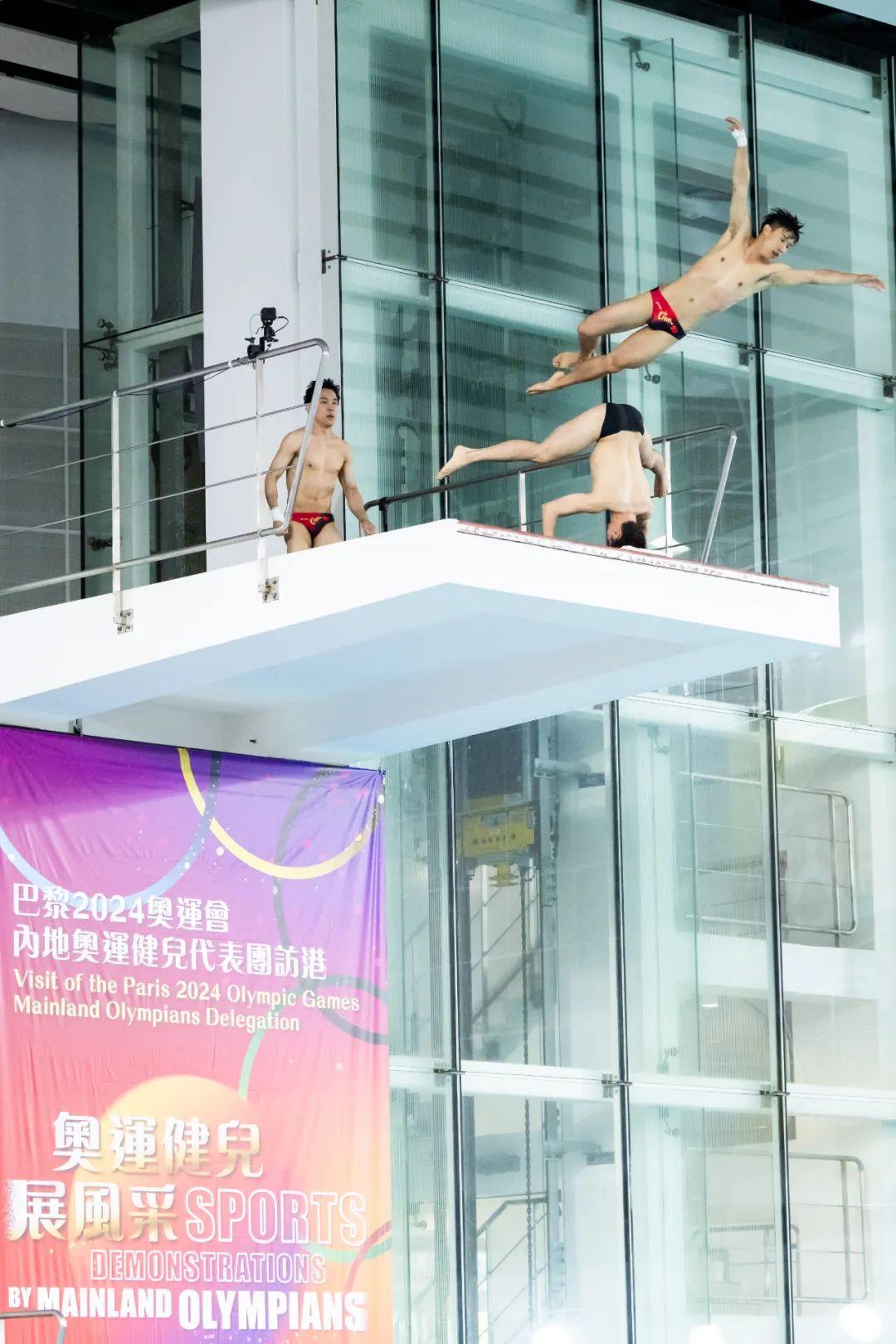 中国跳水“梦之队”的跳水示范为全场带来一个小高潮。全红婵在10米台再现备受香港市民期待的“水花消失术”。值得一提的是,“梦之队”还为香港观众们“设计”了一些特别的表演,10名运动员从5米台以不同姿势鱼贯入水,最后一人还特意摆成一个“大”字入水,溅起大大的水花,引得观众笑声连连。