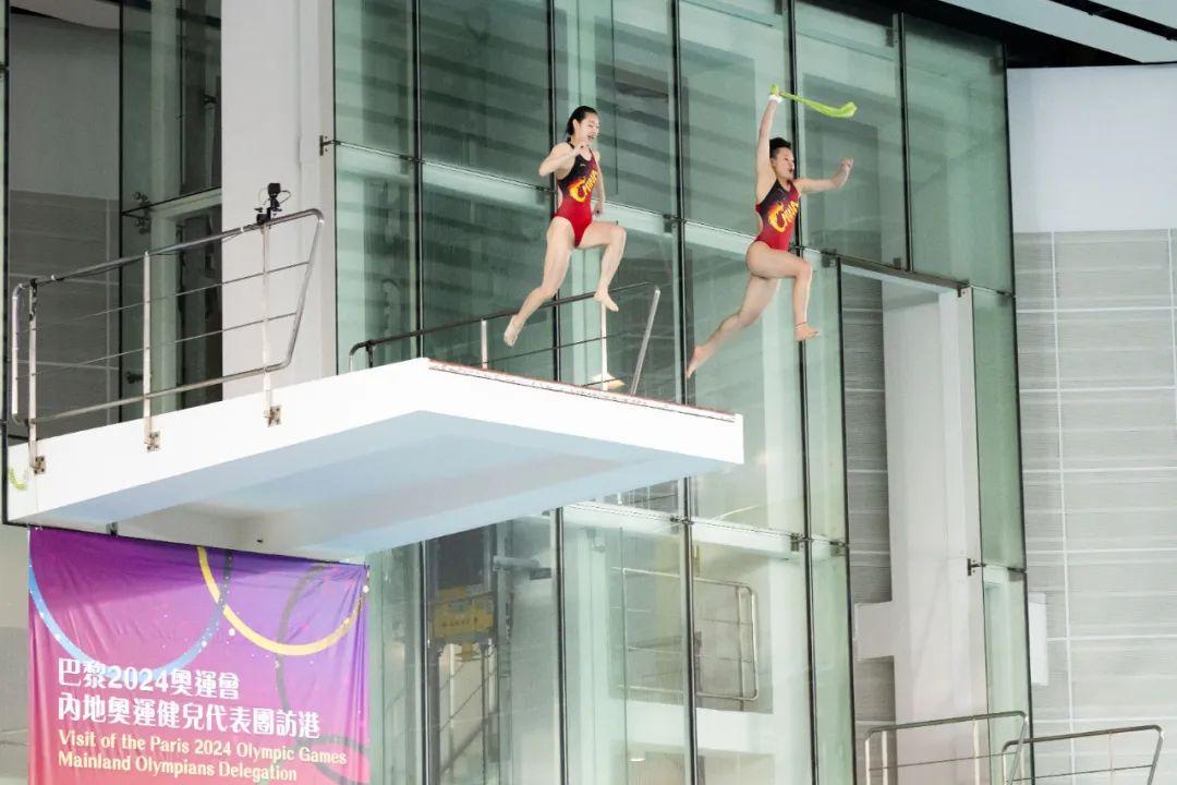 巴黎奥运会内地奥运健儿代表团访港进入第三天行程,备受瞩目的“内地奥运健儿展风采”运动项目示范活动31日上午分别在伊利沙伯体育馆和维多利亚公园游泳池举行。深受香港市民喜爱的运动员们轮番登场,“花式”各展所长。