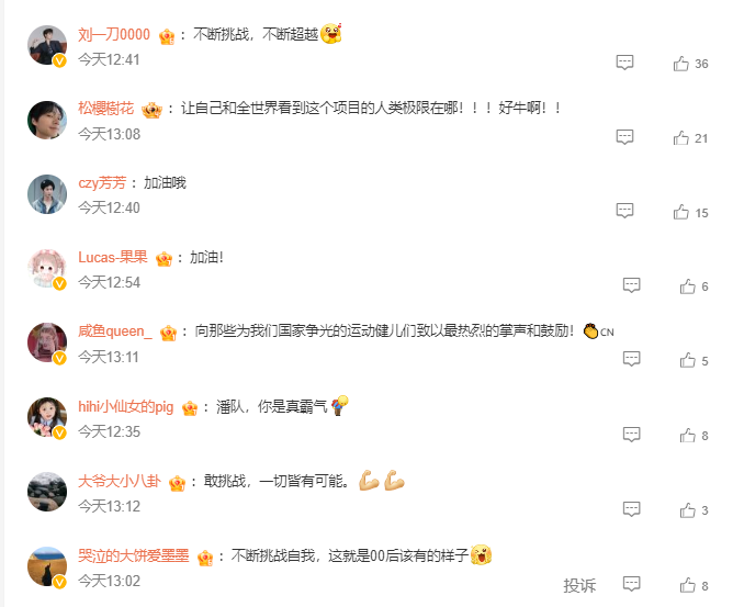 对此,网友们纷纷点赞,“让自己和全世界看到这个项目的人类极限在哪!!!好牛啊!!”“不断挑战自我,这就是00后该有的样子”。