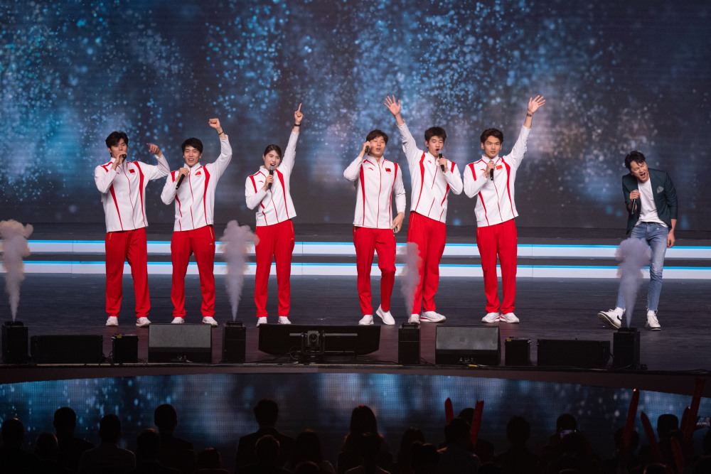 图为乒乓球运动员樊振东(中)献唱歌曲《野孩子》。新华社记者 张金加 摄