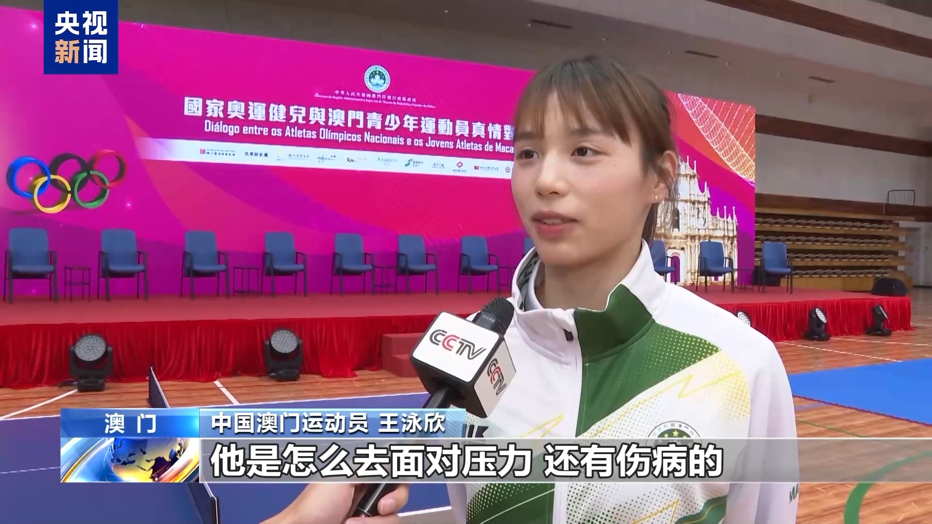 中国澳门运动员 王泳欣:我问了马龙,他是怎么去面对压力还有伤病的,他的回答就是很热爱这项运动,还有他有很多家人或者是团队的支持。我觉得热爱这方面我是非常同意的,因为当你热爱一项运动的时候,无论是遇到什么困难,你都会坚持去做。所以我觉得这一句是非常能打动我的。就是能看到他们,会觉得很想跟他们一样成为这么优秀的运动员,给我们鼓励。