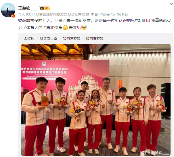 她的混双搭档王楚钦发文道:“收获非常多的几天,还带回来一位新朋友,谢谢每一位新认识的兄弟姐们让我重新感受到了体育人的纯真和快乐,未来见。”