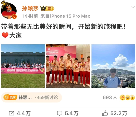 孙颖莎也写道:“带着那些无比美好的瞬间,开始新的旅程吧!爱大家。”
