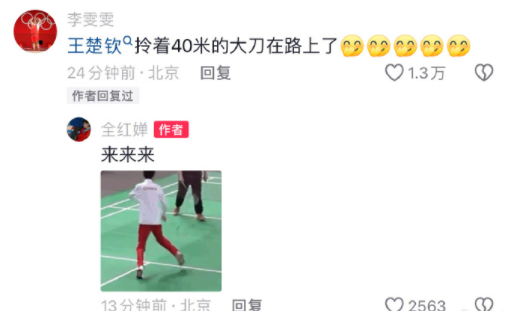 全红婵发视频告别港澳行,视频中出现了王楚钦呼呼大睡的场景。李雯雯赶来评论: “王楚钦拎着40米的大刀在路上了。”全红婵则回复:“来来来”,并配上了盛李豪打羽毛球的表情包。有网友评论道:“现在干饭哥提着枪也来了。”