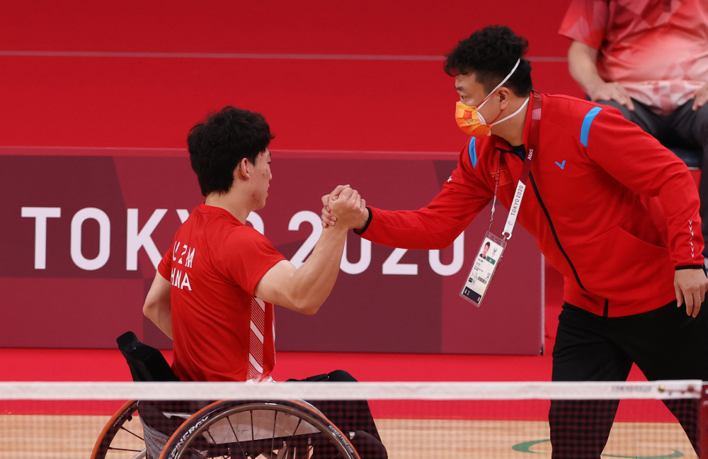 2021年9月4日,在东京残奥会羽毛球男子单打WH1级决赛后,中国队教练董炯(右)祝贺屈子墨。新华社记者 杜潇逸 摄