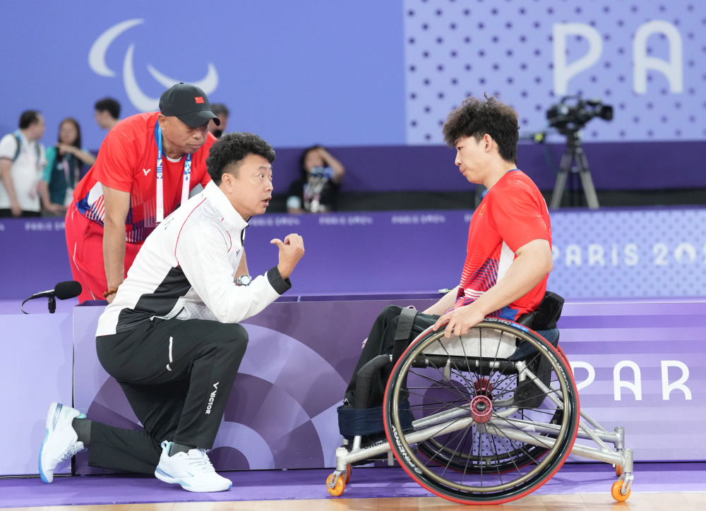 2024年9月2日,在巴黎残奥会羽毛球男子单打WH1级决赛中,中国队教练董炯(前左)在比赛间隙指导屈子墨。新华社记者 贺灿铃 摄