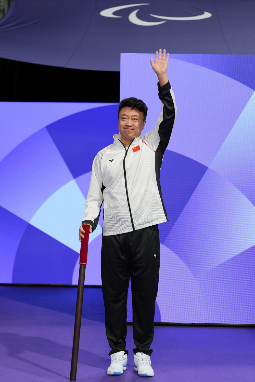 2024年8月29日,中国队教练董炯在巴黎残奥会羽毛球比赛开球仪式上。新华社记者 邢广利 摄