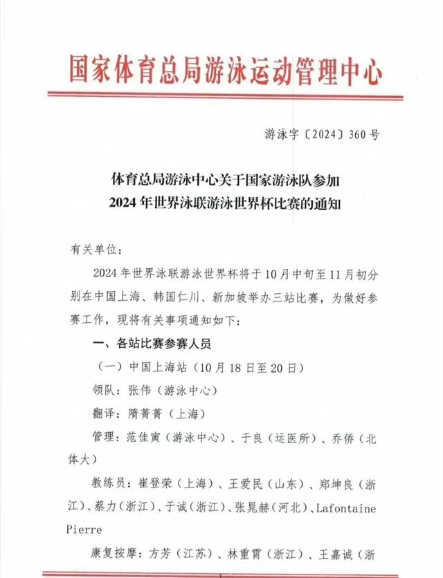 巴黎奥运结束后,世界泳坛开启短池(25米池)节奏。10月18日-20日,国家游泳队将坐镇上海,派出巴黎奥运阵容参加世界杯的比赛。潘展乐、汪顺、徐嘉余、覃海洋、孙佳俊、张雨霏、叶诗文、李冰洁、杨浚瑄、唐钱婷等世界级名将都在中国队公布的名单中。