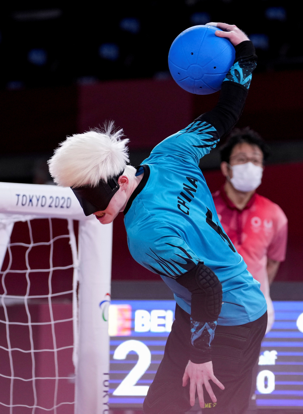 胡明耀在东京残奥会盲人门球男子小组赛中进攻(2021年8月26日摄)。新华社记者 胡虎虎 摄