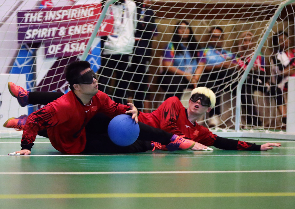 胡明耀(右)在雅加达亚残运会盲人门球男子半决赛中防守(2018年10月11日摄)。新华社记者 王东震 摄