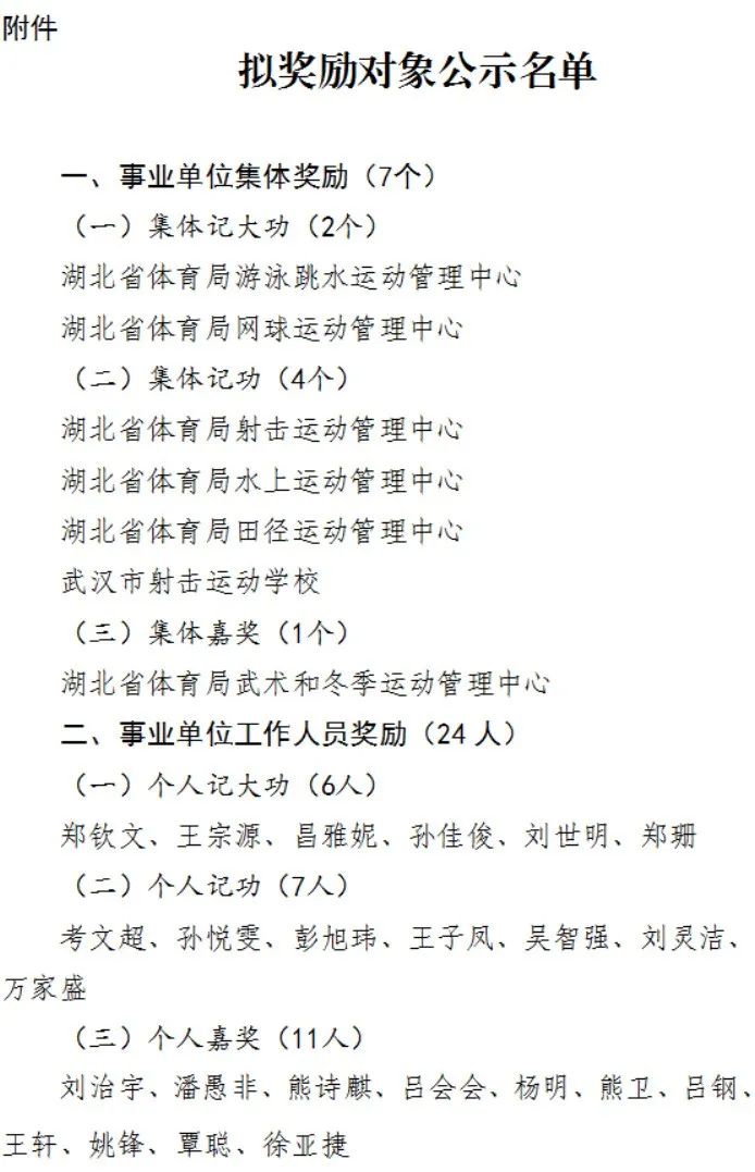 根据《事业单位工作人员奖励规定》及《湖北省重大体育比赛奖励办法》,省人社厅、省体育局拟对在第三十三届夏季奥运会参赛备战工作中表现突出的24名事业单位工作人员、7个事业单位集体分别给予记大功、记功和嘉奖,现将拟奖励对象予以公示(公示名单附后)。