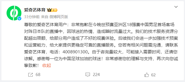 比赛结束后两个小时,爱奇艺体育发文回应了此事。爱奇艺体育官微发消息致歉称,在今晚世预赛亚洲区18强赛中国男足首场客场对阵日本队的直播中,因球迷的热情,造成瞬时流量过大。其技术服务资源分配超出限额,给部分用户造成了不好的观赛体验。