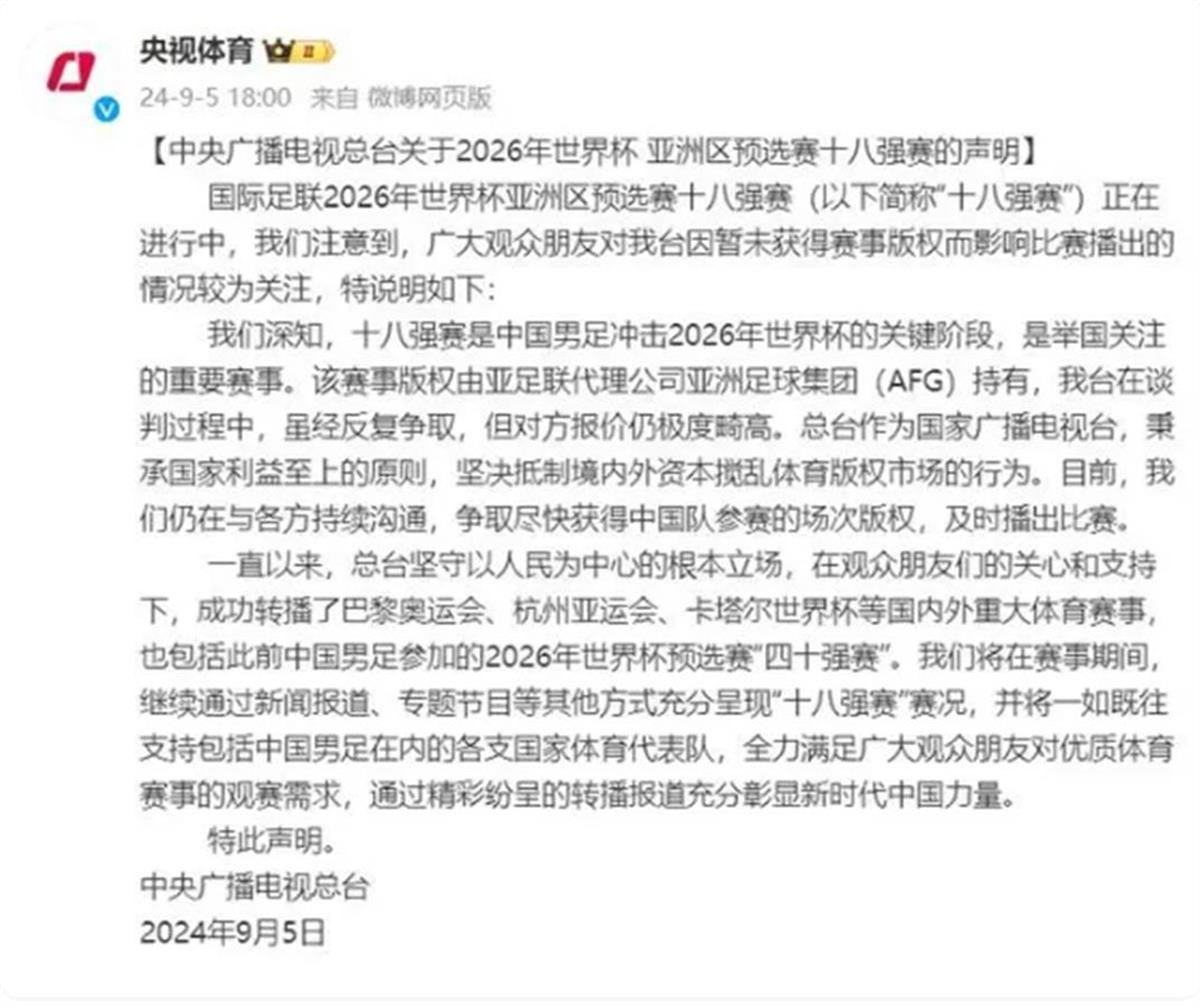 9月5日18:35,世预赛亚洲区第三阶段(18强赛)C组第1轮,中国男足将在客场对阵日本队。央视体育官方微博发布声明,解释不转播2026年世界杯亚洲区预选赛十八强赛的原因。不过,1个小时后,该微博已经删除了这一声明。
