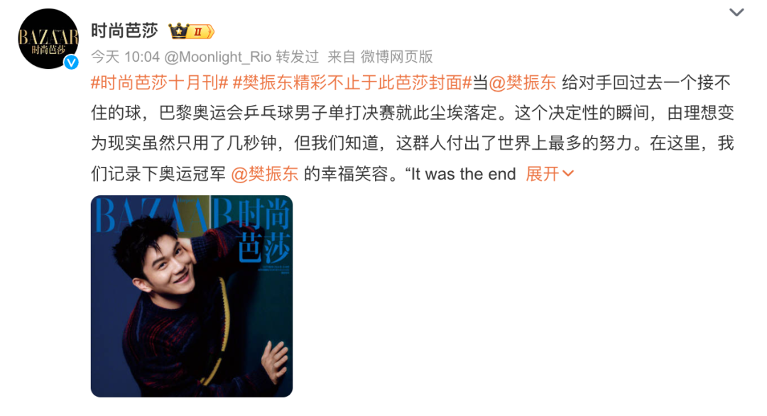 时尚芭莎官方微博发文阐释为什么拍樊振东: