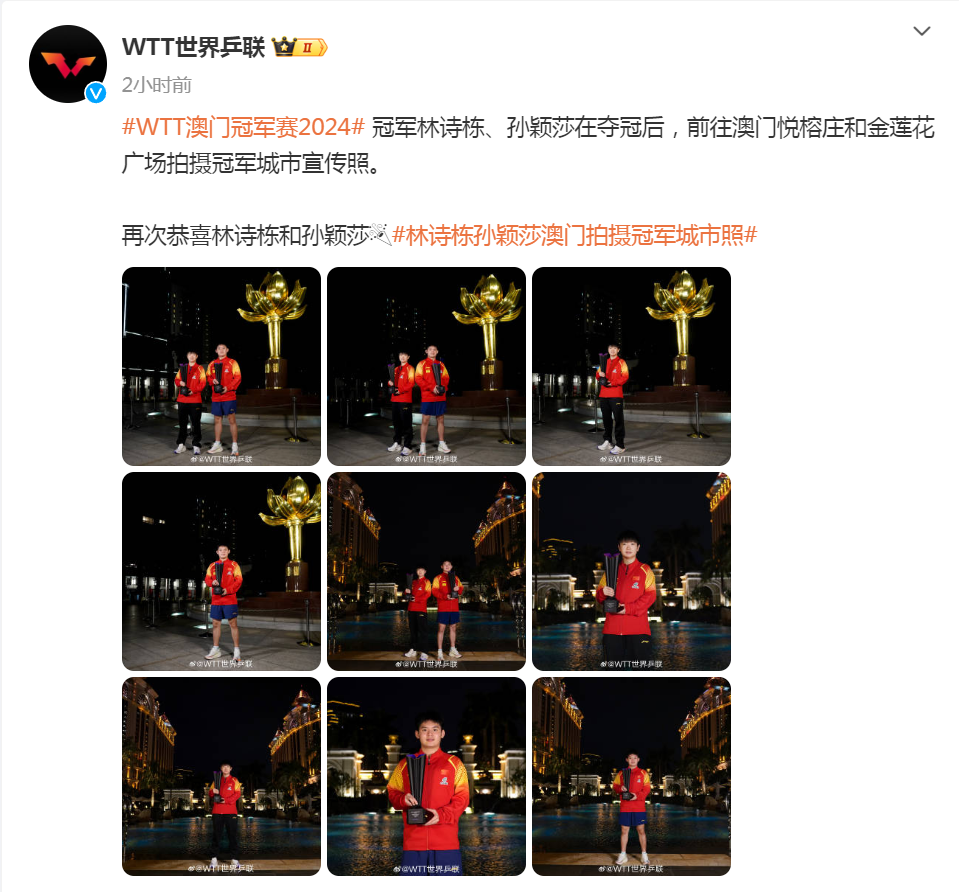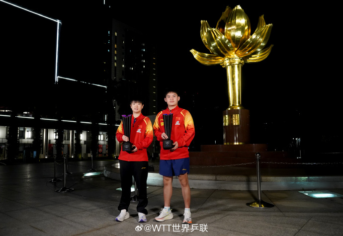 据@WTT世界乒联微博 消息,冠军林诗栋、孙颖莎在夺冠后,前往澳门悦榕庄和金莲花广场拍摄冠军城市宣传照。