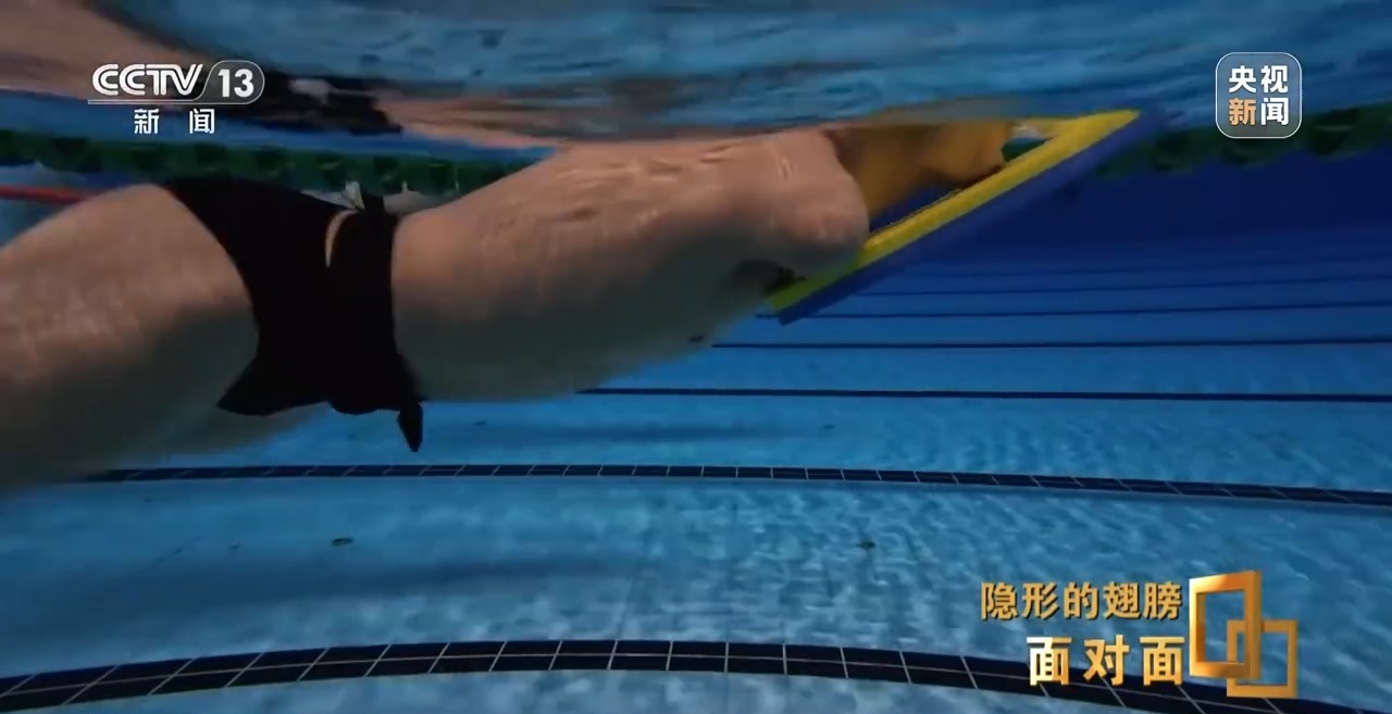 因为没有双臂,郭金城最初是用下巴抵住漂流板练习,核心力量的训练成为保持水下平衡的关键。