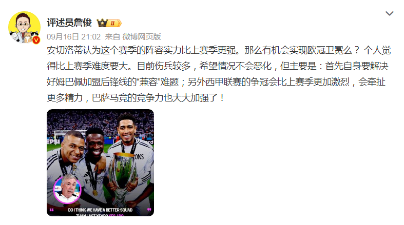 皇马将在北京时间9月18日凌晨迎来欧冠比赛,著名解说员詹俊在社媒发表了自己的看法。