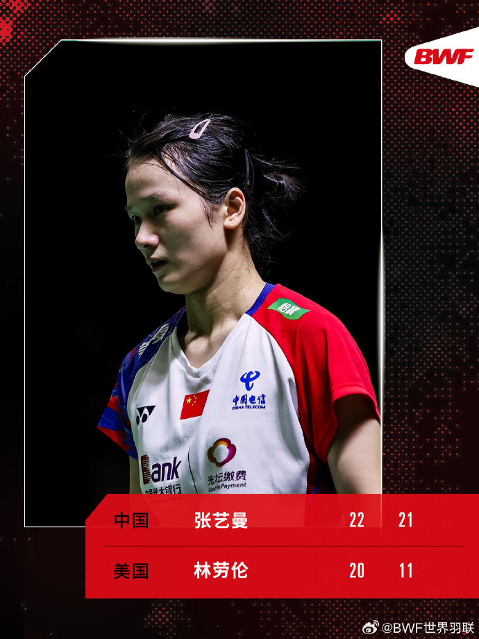 女单首轮,张艺曼2-0击败美国选手林劳伦,两局比分为22-20、21-11。