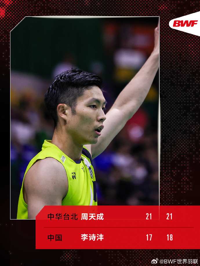 李诗沣0-2不敌中国台北老将周天成无缘16强,两局比分为17-21、18-21。