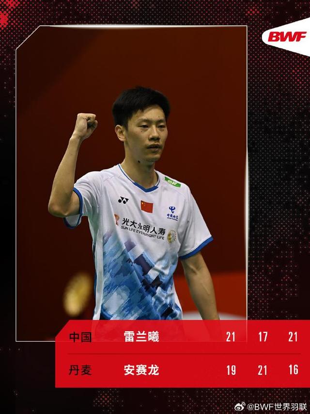 男单首轮,雷兰曦经过三局苦战2-1击败奥运冠军丹麦选手安赛龙,三局比分为21-19、17-21、21-16。