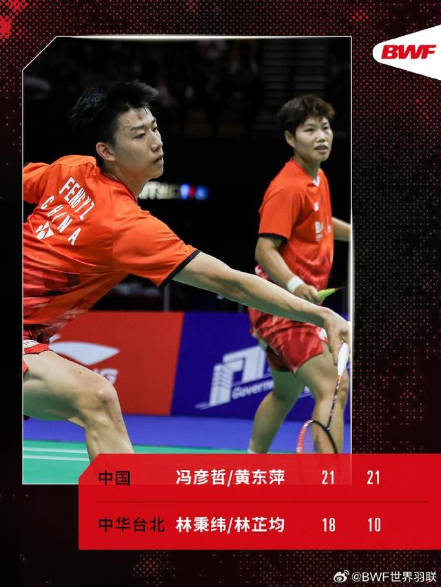 在混双首轮的一场比赛中,中国组合冯彦哲/黄东萍2-0击败中国台北组合林秉纬/林芷均晋级第二轮,两局比分为21-18、21-10。