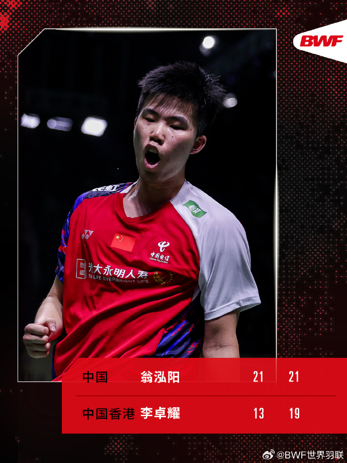 另外一场比赛中,翁泓阳2-0击败中国香港选手晋级第二轮,两局比分为21-13、21-19。