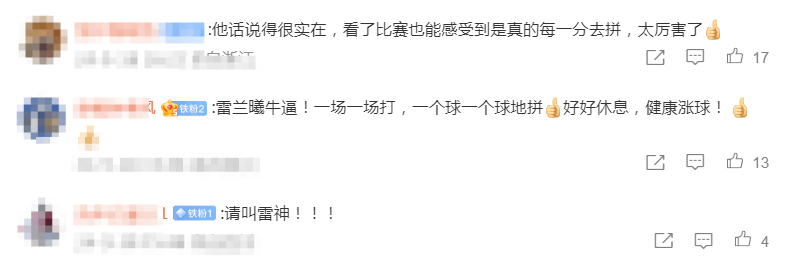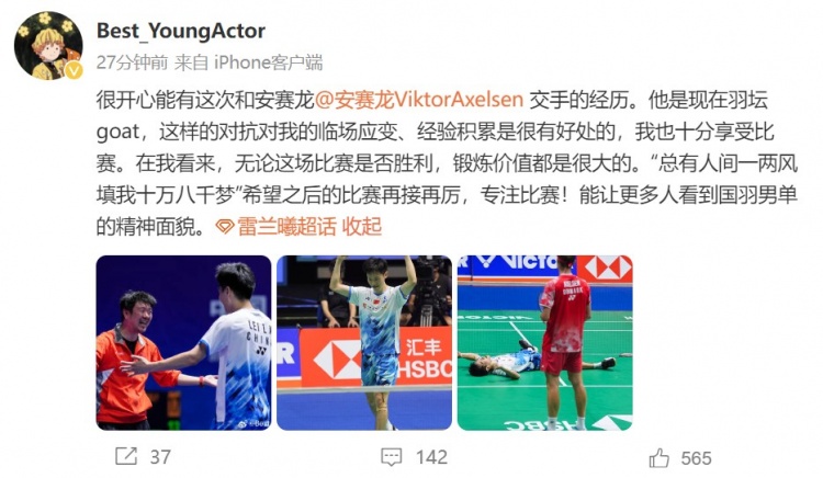 雷兰曦写道:很开心能有这次和安赛龙交手的经历。他是现在羽坛goat,这样的对抗对我的临场应变、经验积累是很有好处的,我也十分享受比赛。在我看来,无论这场比赛是否胜利,锻炼价值都是很大的。“总有人间一两风 填我十万八千梦”希望之后的比赛再接再厉,专注比赛!能让更多人看到国羽男单的精神面貌。