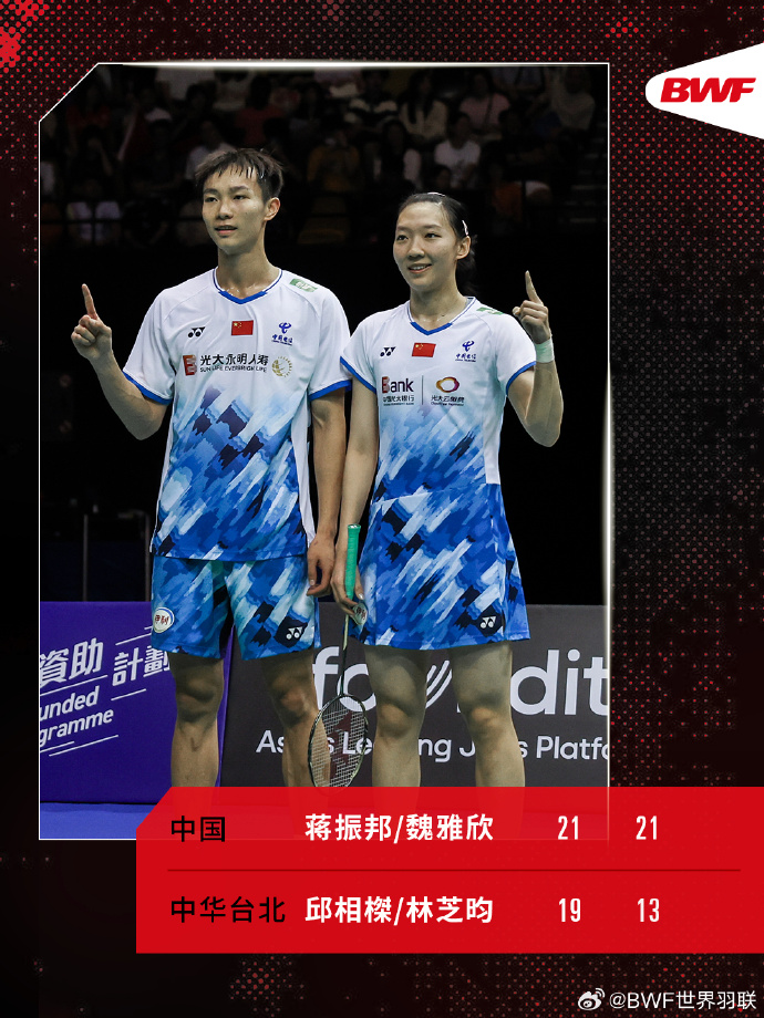 另外一对中国组合蒋振邦/魏雅欣2-0击败中国台北组合邱相榤/林芝昀晋级下一轮,两局比分为21-19、21-13。