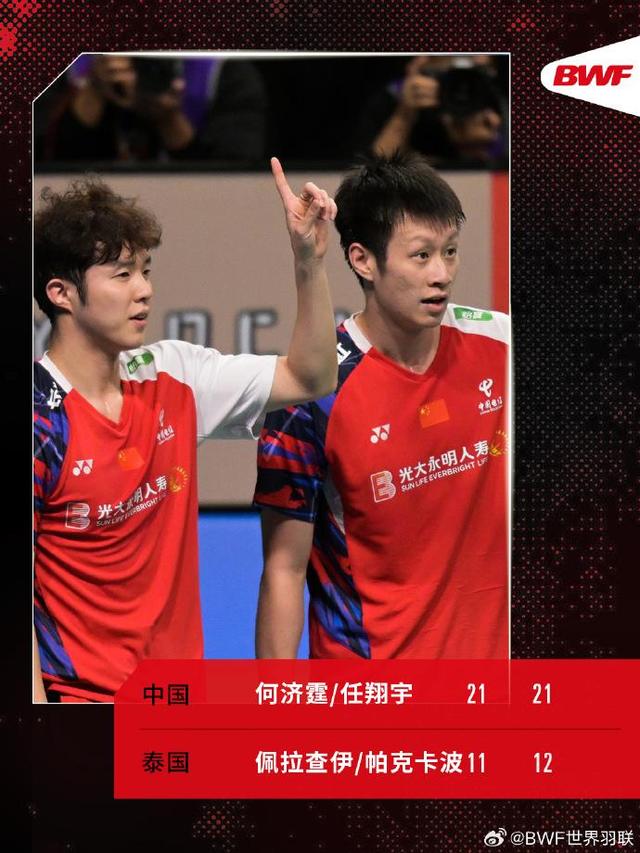 男双首轮,何济霆/任翔宇2-0击败泰国组合佩拉查伊/帕克卡波晋级第二轮,两局比分为21-11、21-12。