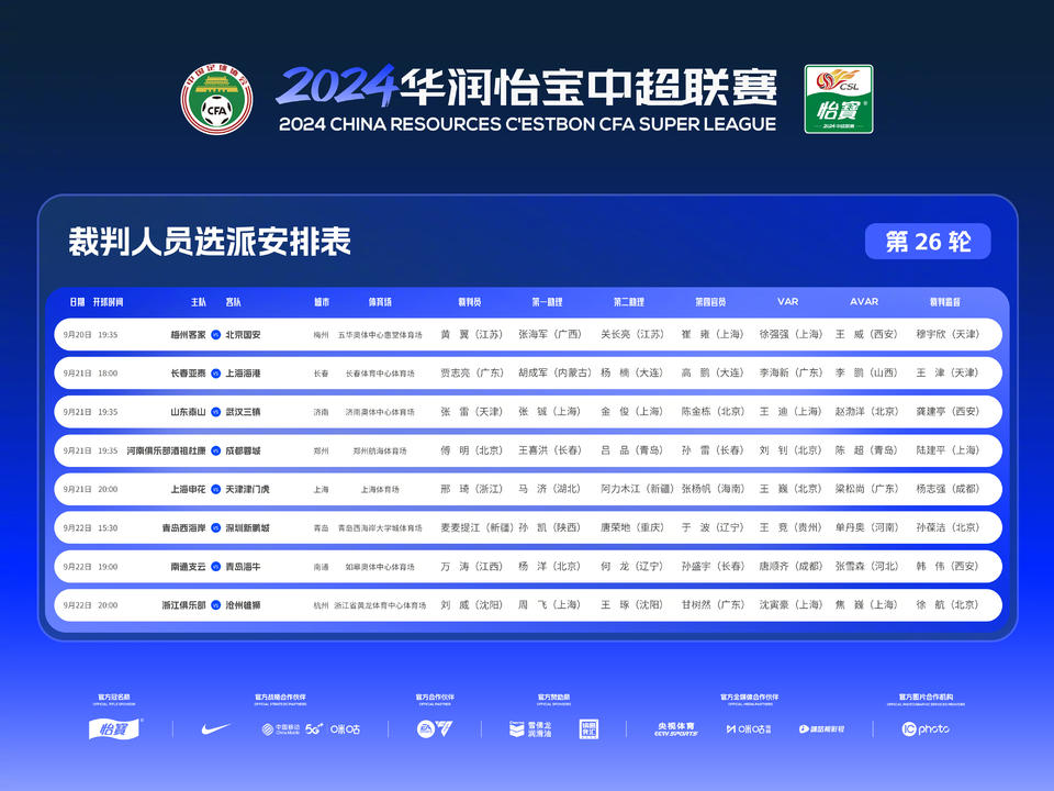 其他场次方面,傅明执法河南队与成都蓉城的比赛,麦麦提江执法西海岸vs新鹏城之间的“保级大战”。参与亚冠首轮执法的马宁,将缺席本轮比赛执裁。(大众新闻·齐鲁壹点客户端季禹)