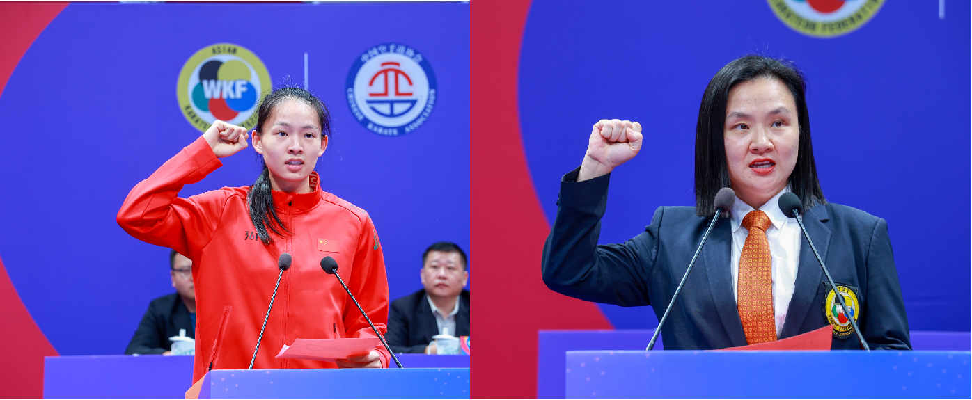运动员代表李巧巧和裁判员代表马俊婷分别代表全体运动员和裁判员宣誓。亚空联副主席RASHID AL ALI宣布比赛正式开幕。