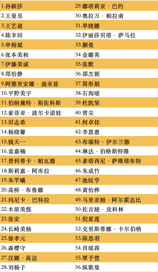 女子单打正赛名单如下: