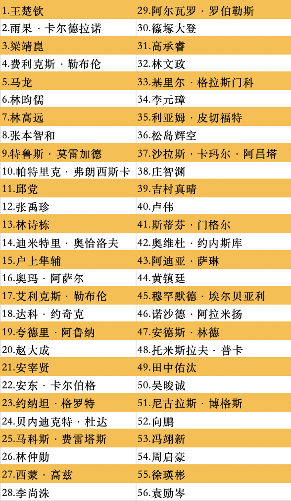 男子单打正赛名单如下: