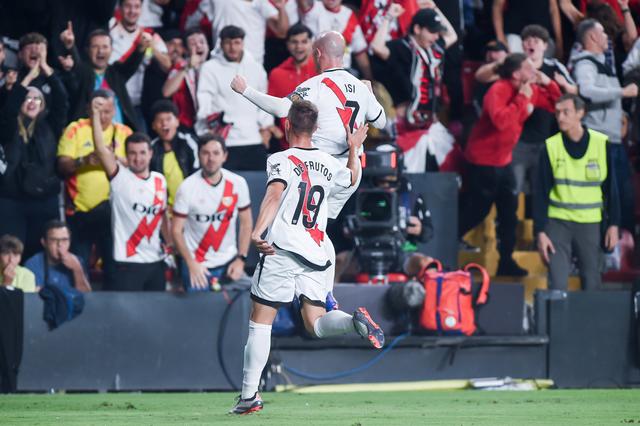 9月22日,巴列卡诺队球员帕拉松(前上)在比赛中进球后庆祝。新华社发(古斯塔沃·巴连特摄)