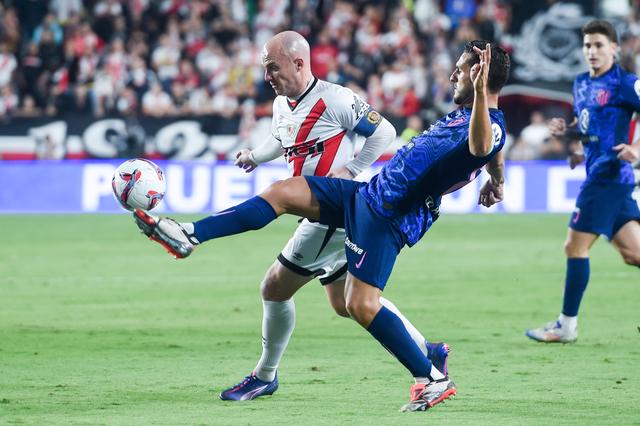 9月22日,马德里竞技队球员略伦特(前)与巴列卡诺队球员乌奈·洛佩斯在比赛中拼抢。新华社发(古斯塔沃·巴连特摄)