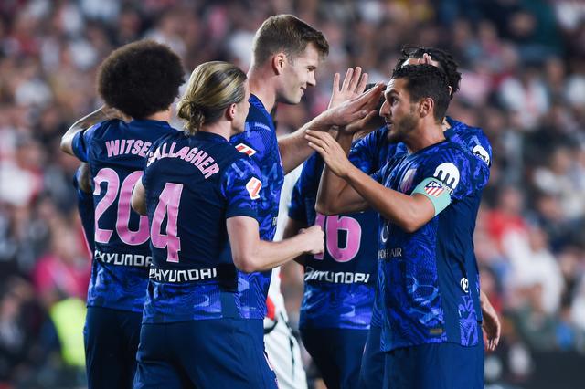 9月22日,马德里竞技队球员加拉格尔(右一)在比赛中进球后与队友庆祝。新华社发(古斯塔沃·巴连特摄)